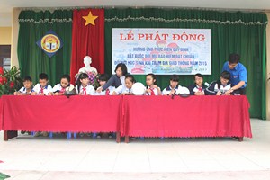 Tất cả học sinh Hưng Đạo cùng ký cam kết thực hiện nghiêm túc việc đội mũ bảo hiểm đạt chuẩn đúng cách khi tham gia giao thông trên xe mô tô xe gắn máy năm 2015.